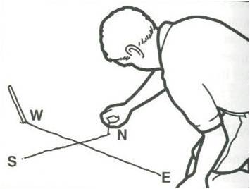 3. Drive the short stick into the ground and connect the short stick and the long stick by drawing a line. This is your north south line.
